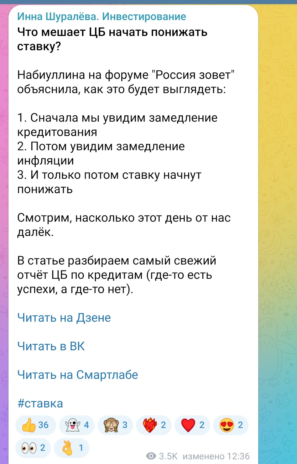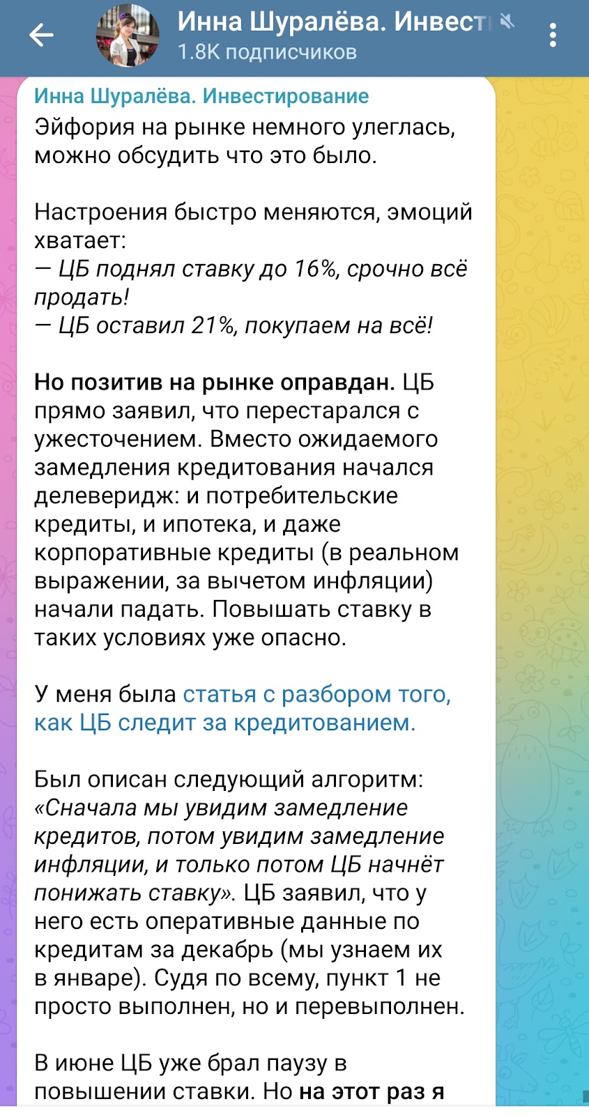Также для больших статей Инна Шуралева пользуется другими соцсетями, а в Телеграмме выкладывает на них ссылку. Так например, прочитать о том, что мешает ЦБ начать понижать ставку, а также увидеть свежий отчет по кредитам можно на Дзене, Вк или Смартлабе. Помимо этого у автора есть отдельный сайт со статьями Shuraleva invest ru.