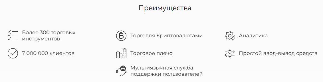Платформа ярко рекламирует свои услуги прямо у себя на сайте, заявляя об огромном количестве преимуществ. Интересно, что авторы, например, считают своим плюсом возможность торговать криптовалютами, хотя это в принципе основное назначение сервиса. Другие же преимущества кажутся либо слишком абстрактными, допустим, “простой” ввод и вывод средств, либо просто неподтвержденными – 7 млн. клиентов и 300+ торговых инструментов.
