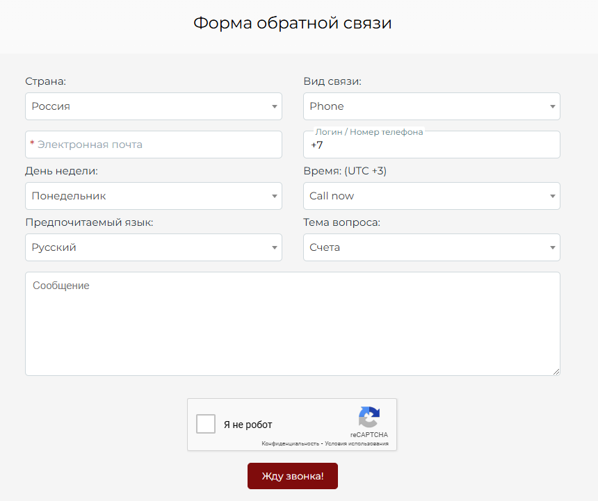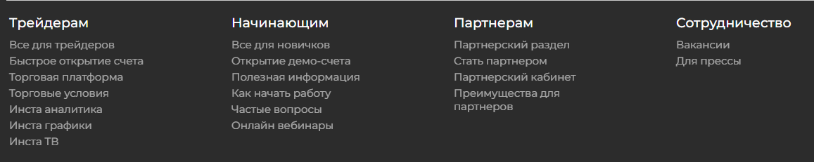 Отдельного внимания заслуживает служба поддержки проекта, а точнее, ее устаревшие способы работы. Клиент для отправки вопроса должен заполнить целую форму, при этом он должен указать некоторые детали, которые нужны будто лишь для усложнения процесса. Например, от пользователя зачем-то требуют написать даже день недели. Все серьезные брокеры давно перешли на быстрый чат со службой поддержки, здесь же ответа, похоже, придется ждать несколько дней.Внизу страницы Instaspot Trade представлены все разделы, среди которых, безусловно, есть важные и полезные. Однако среди такого обилия нет самого главного – документов. Тут отсутствует даже банальная политика конфиденциальности, а лицензии и сертификаты, подтверждающие легальность, тем более.