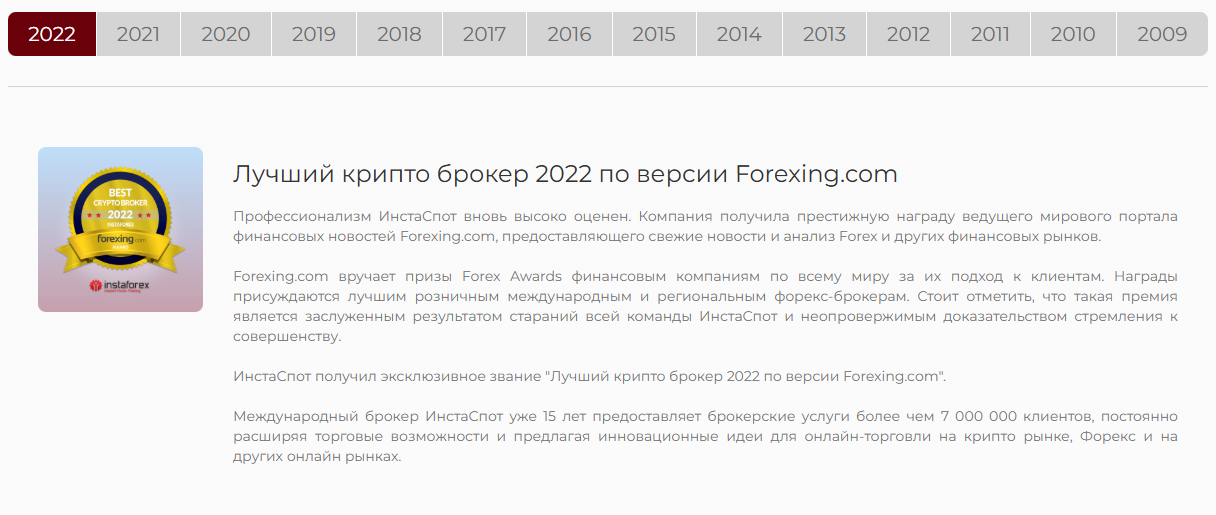 Зато создатели упорно пытаются подтвердить надежность площадки разными способами. На сайте для этого существует целый раздел с наградами, где есть трофеи за каждый год с 2009. Вот только заканчиваются они почему-то еще в 2022-м, а сейчас уже 2025-й. При этом главное здесь другое – если проверить данные номинации то можно узнать, что их победителями отмечается не Instaspot, а InstaForex.