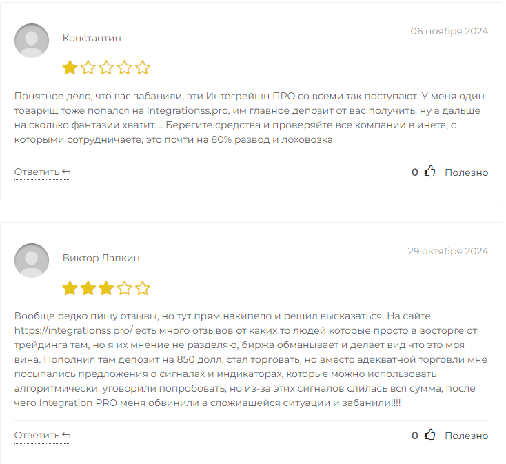 На независимых площадках было найдено множество негативных отзывов о Integrationss pro, где пользователи отмечают, что их кошелек был в блокировке после того как они пополнили аккаунт, все сделки фейковые, а сама организация — обман.