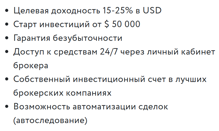 Брокер предлагает доходность 15–25% годовых в долларах. Это намного больше, чем в 2025 году дают валютные депозиты в российских банках. По ним выплаты не превышают 2–4%. Слишком «сладкие» предложения часто исходят от аферистов. При этом порог входа составляет $50 тыс. Чтобы воспользоваться услугами конторы, клиент должен рискнуть крупной суммой. Это тоже создает большой риск.