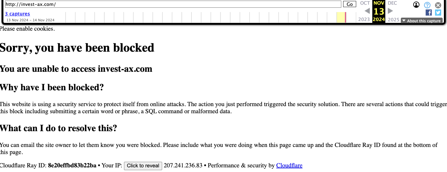 Так как в интернете нет информации о платформе invest ax com, мы попытались запросить снимки ее сайта из Whois. В результате обнаружили, что в сервисе присутствуют три снэпшота ресурса.