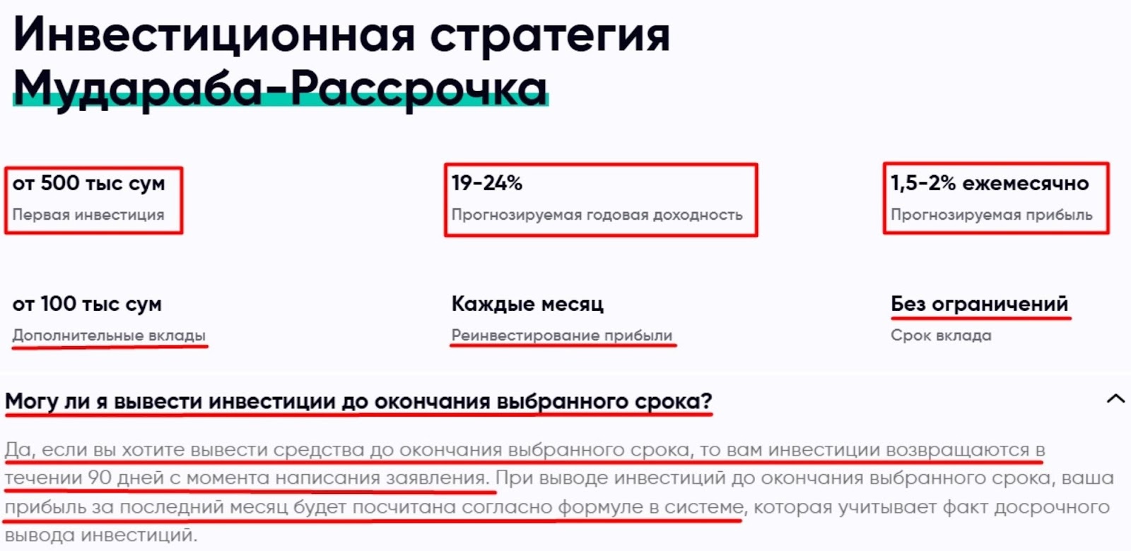 Организация iman capital ltd предлагает клиентам инвестировать от 500 тысяч узбекских сум с ежемесячной доходностью в 1,5-2,0%. Срок вклада не ограничен. Платформа дает участникам возможность к реинвестированию прибыли от 100 тысяч сум. Но вывести депозит на кошелек досрочно можно только через 3 месяца.
