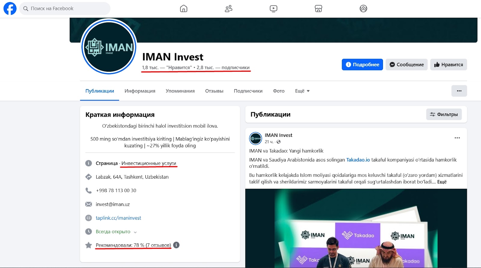Профиль на facebook набрал 2800 подписчиков и 1800 лайков. Аккаунт компании дублирует контент из других соцсетей. 78% пользователей рекомендуют инвестиционные услуги проекта, чтобы заработать.