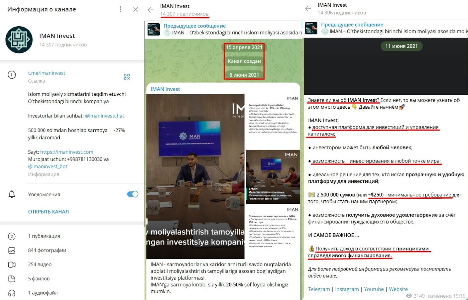 Телеграм-канал iman invest ведется с 2021 года. В сообществе 14 тысяч пользователей. Публикации оформляются на нескольких языках и содержат новостную информацию платформы. При проверке выявлено, что 50% подписчиков читают публикации, но комментарии отключены.