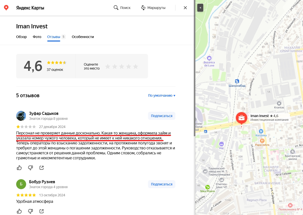 На Яндекс Картах в Узбекистане клиенты могут ознакомиться с отзывами про брокера иман инвест. Один из инвесторов сообщил об ошибке в документах другого человека из-за чего его ищут кредиторы. Данная ситуация отрицательно характеризует обслуживание техподдержки.