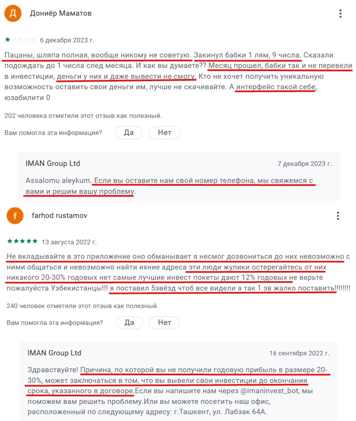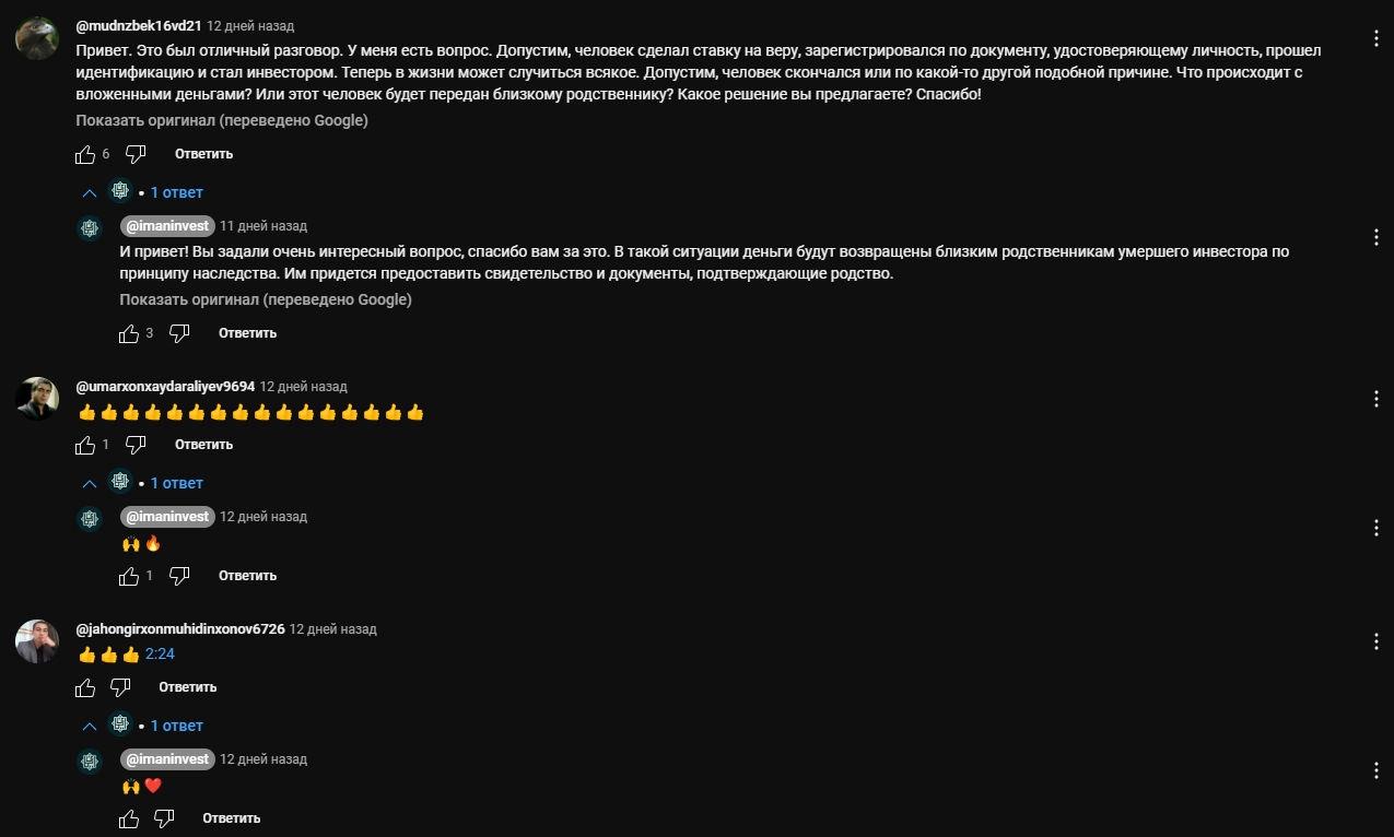 В интернете пользователи могут ознакомиться с отзывами о проекте иман инвест в Узбекистане и Казахстане. Комментарии о компании invest iman uz неоднозначные. Например, один из подписчиков на youtube задает обстоятельный вопрос и получает ответ от представителя организации. Положительные сообщения не похожи на фейковые.