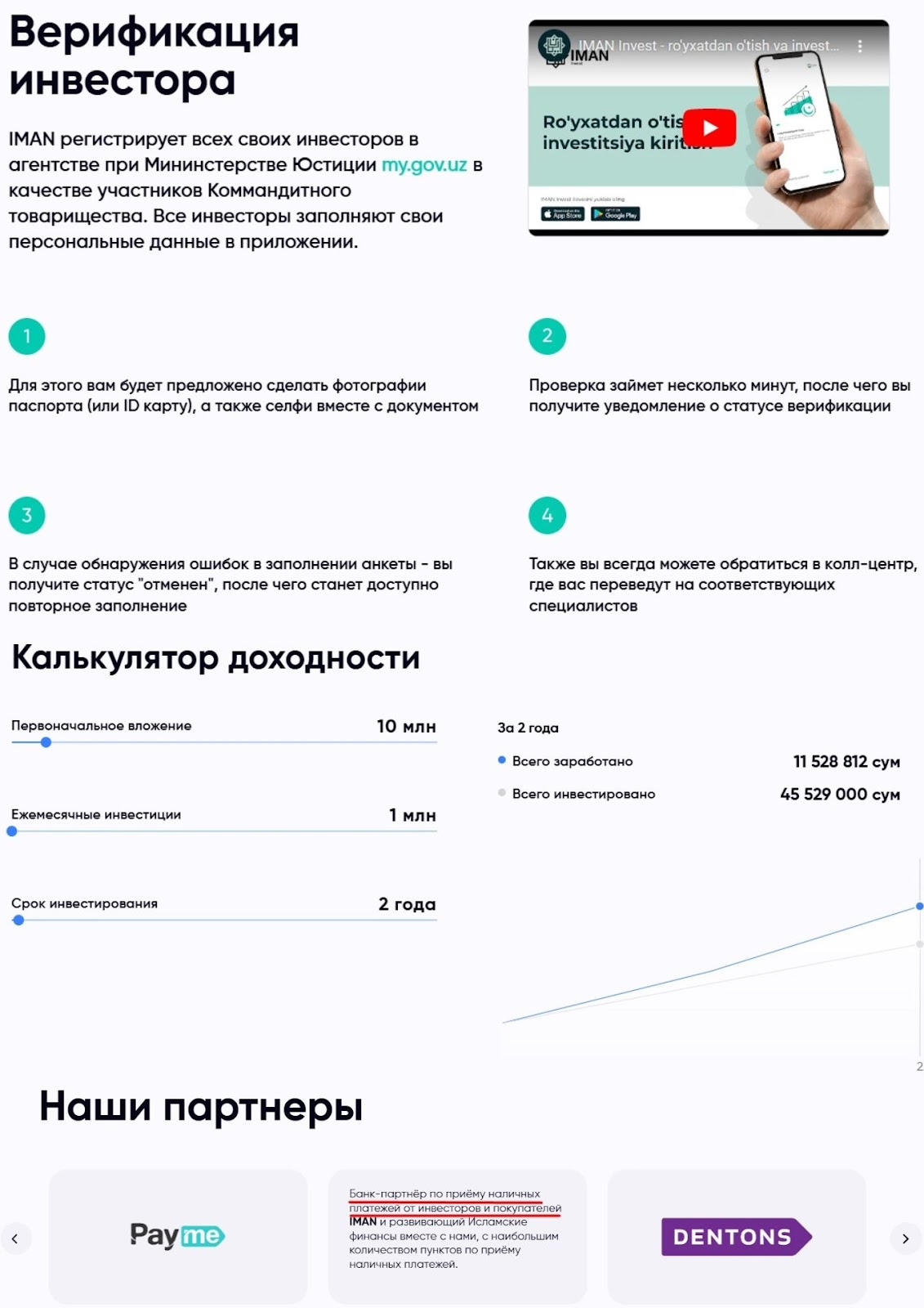 Перед сотрудничеством пользователи могут ознакомиться с партнерами компании и рассчитать предварительную доходность в интерактивном калькуляторе. Для инвестирования клиентам необходимо пройти верификацию. Компания imaninvest проводит регистрацию инвесторов в агентстве при Министерстве Юстиции, что считается надежным фактором.