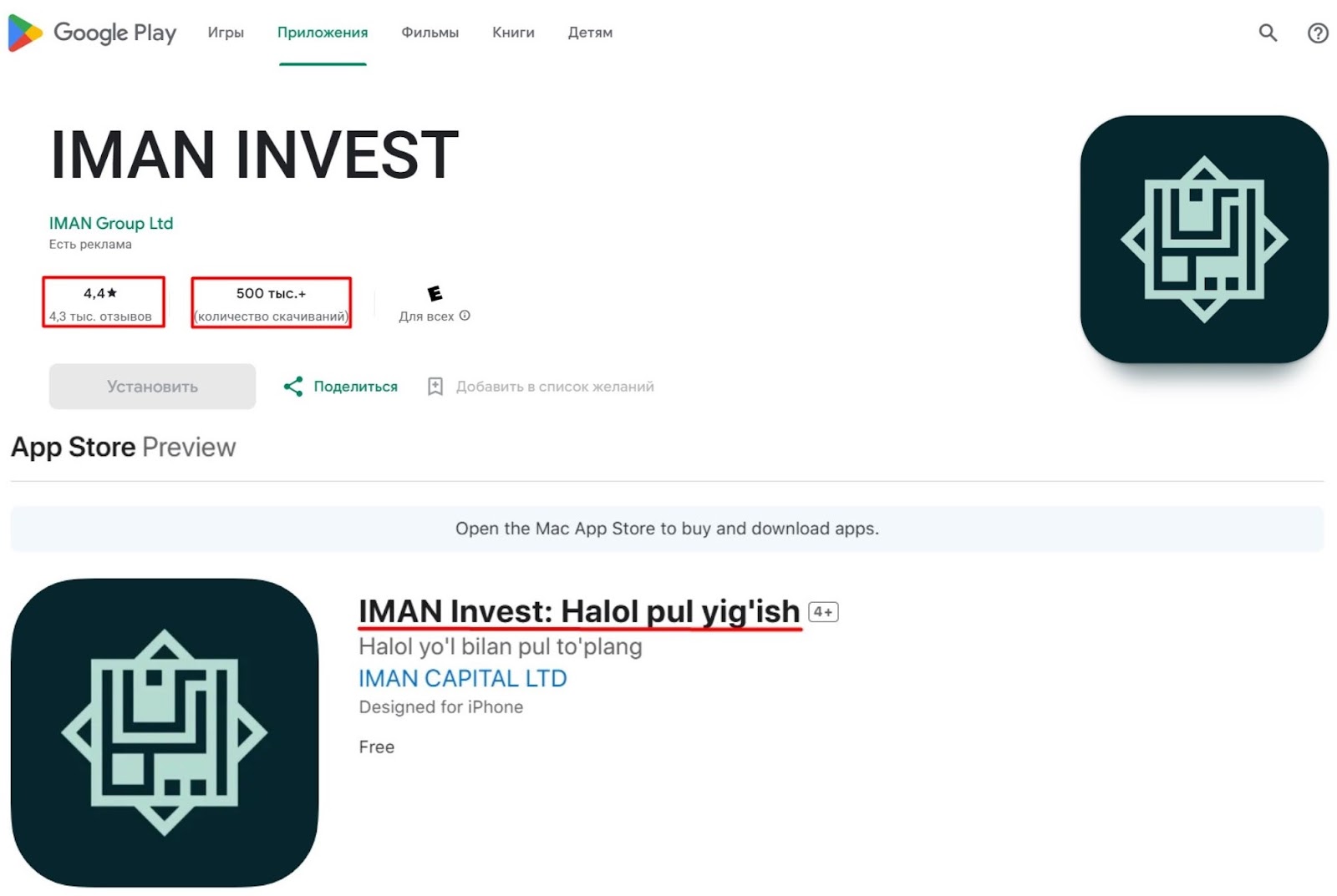Инвестиционный сервис доступен в виде мобильного приложения. Например, в App Store программа называется IMAN Invest Halol pul yig ish. В Google Play у проекта 500 тысяч скачиваний и оценка выше средней. К преимуществам пользователи относят удобный интерфейс и терминал для оплаты.