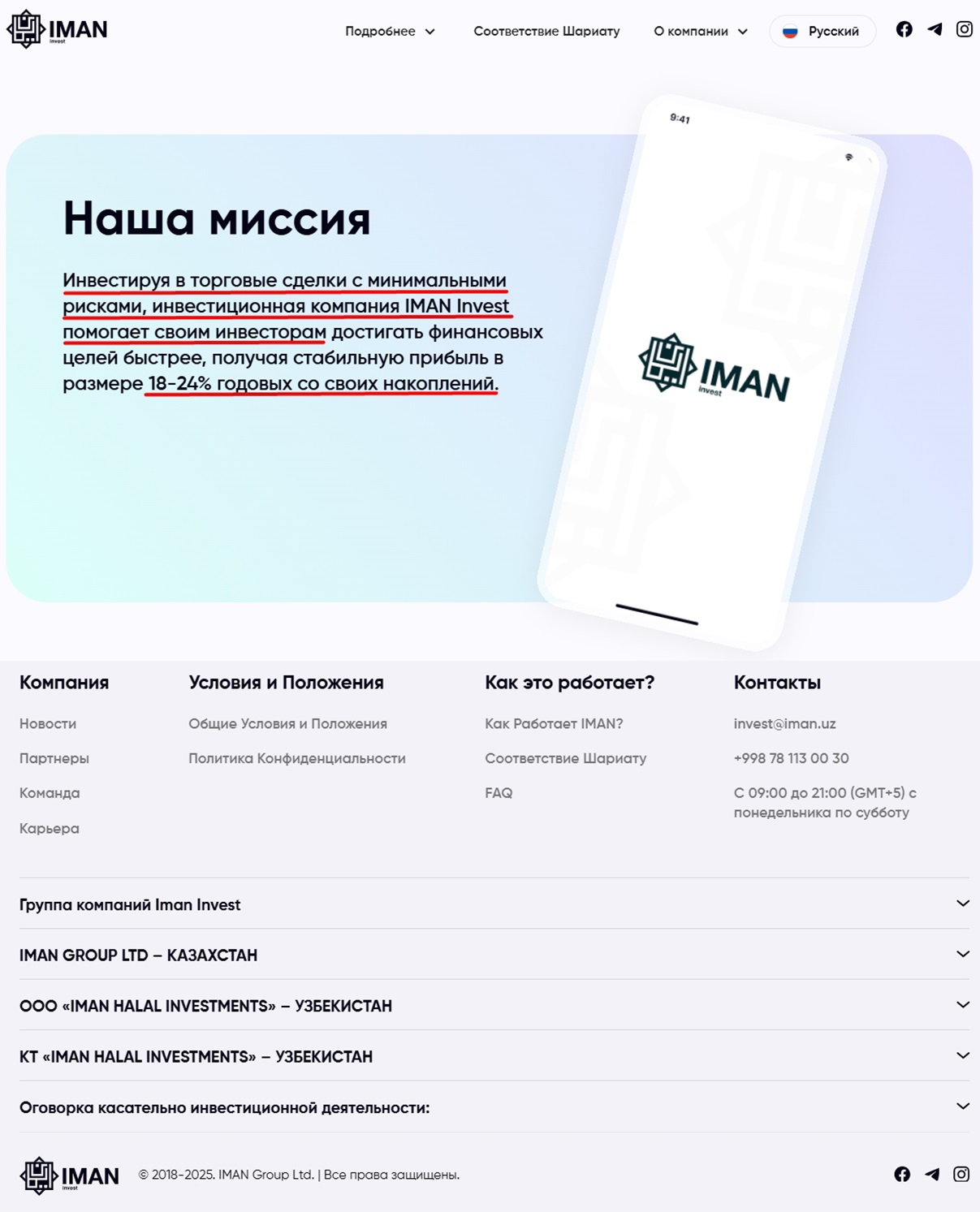 Imaninvest com это сайт инвестиционной платформы для жителей Узбекистана и Казахстана. Брокерский проект предлагает доходность от инвестиций в размере 18-24% годовых. Компания зарегистрирована в Казахстане как iman group ltd, а в Узбекистане как IMAN HALAL INVESTMENTS. Веб-ресурс доступен пользователям на русском языке.