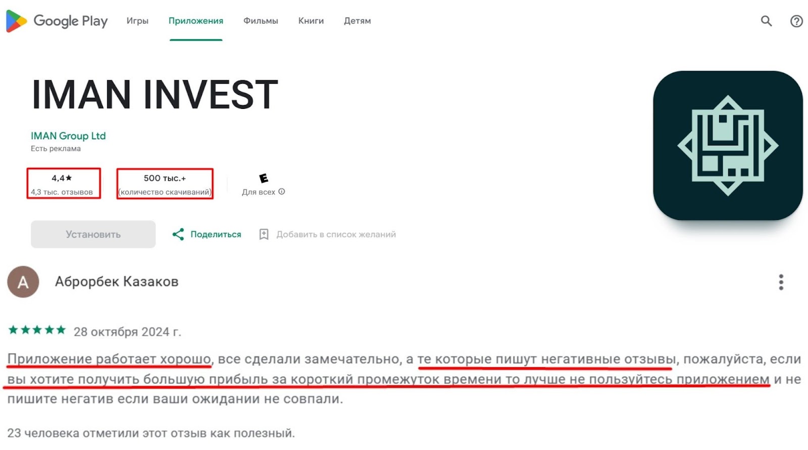 Пользователи положительно оценивают платформу iman invest и мобильное приложение. Например, в Google Play рейтинг программы 4,4. Один из инвесторов сообщает, что компания работает в соответствии с договором оферты и его счет не подвергался блокировке.