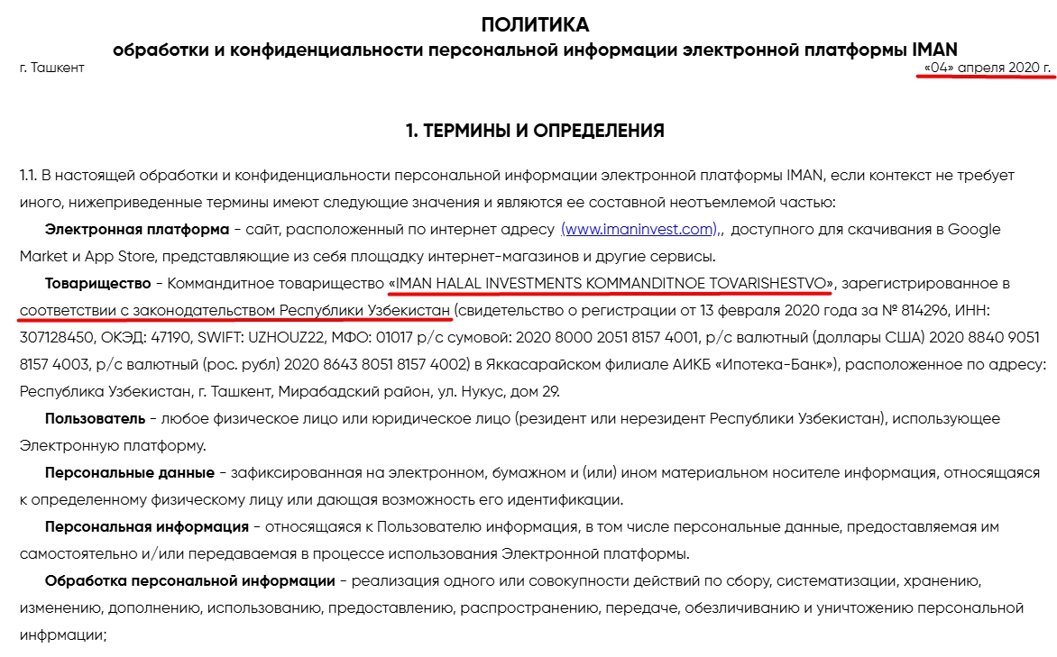 В политике конфиденциальности сотрудничество позиционируется как IMAN HALAL INVESTMENTS KOMMANDITNOE TOVARISHESTVO. Регулирующий документ датирован 4 апреля 2020 года. Торговые лицензии организация не предоставляет, но брокер указывает на локальную государственную регуляцию.