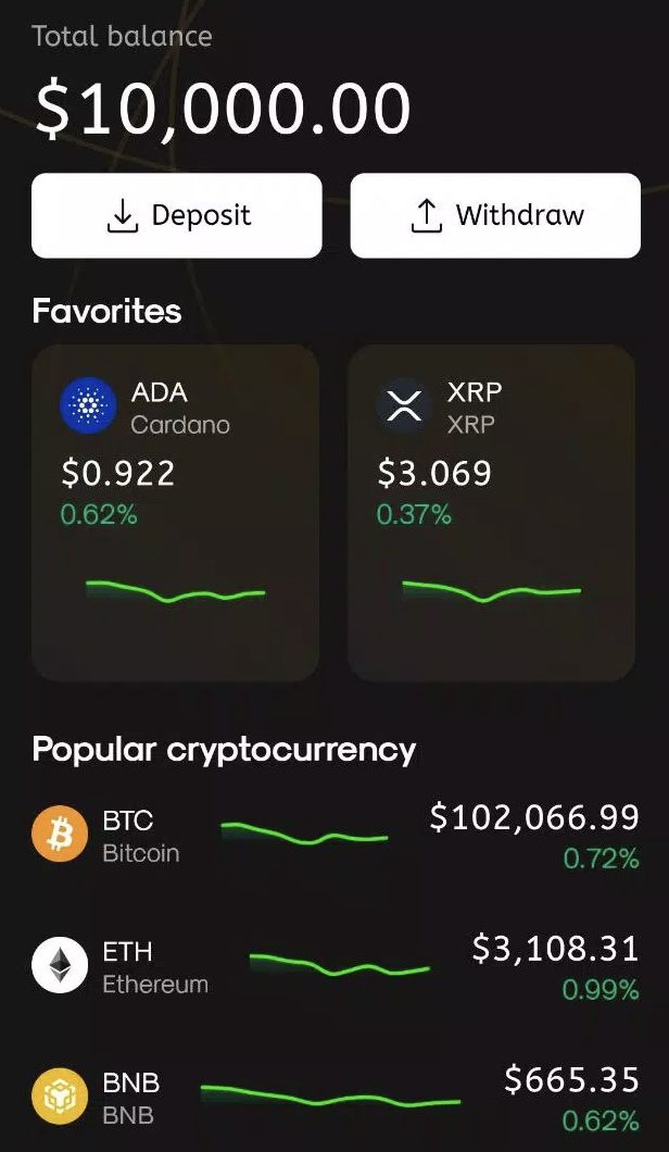 Приложение имеет очень простой и понятный дизайн. Чтобы начать торговать, необходимо сначала выбрать ваш опыт работы в крипте, затем кликнуть на интересующую криптовалюту и подключить кошелек. После выбора крипты, стоит нажать кнопку «Buy» или «Sell» в зависимости от того собираетесь вы покупать или продавать свои активы.
