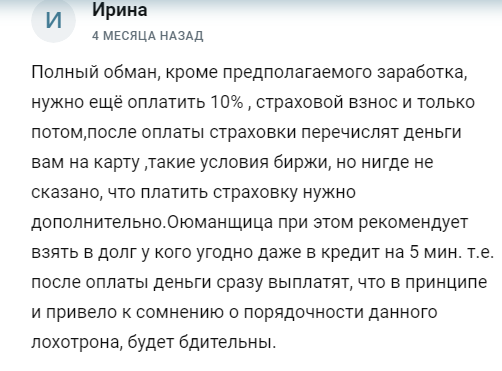 Например, обманутые клиенты сообщают, что как только приходит время платить по счетам, Invest firstoff сообщает, что перед тем, как получить депозит и приработок, нужно внести налоговый взнос и оплатить услуги гаранта. Трейдер призывает клиентов взять в долг у друзей или оформить кредит, но оплатить ее услуги в полном объеме. Гарантий, что после оплаты всех налогов и комиссий, обещанный пассивный доход поступит на счет клиента, нет.