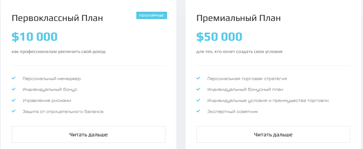 4. «Первоклассный план». Депозит от 10 000 долларов, индивидуальный бонус, обслуживание менеджером, защита от отрицательного баланса.