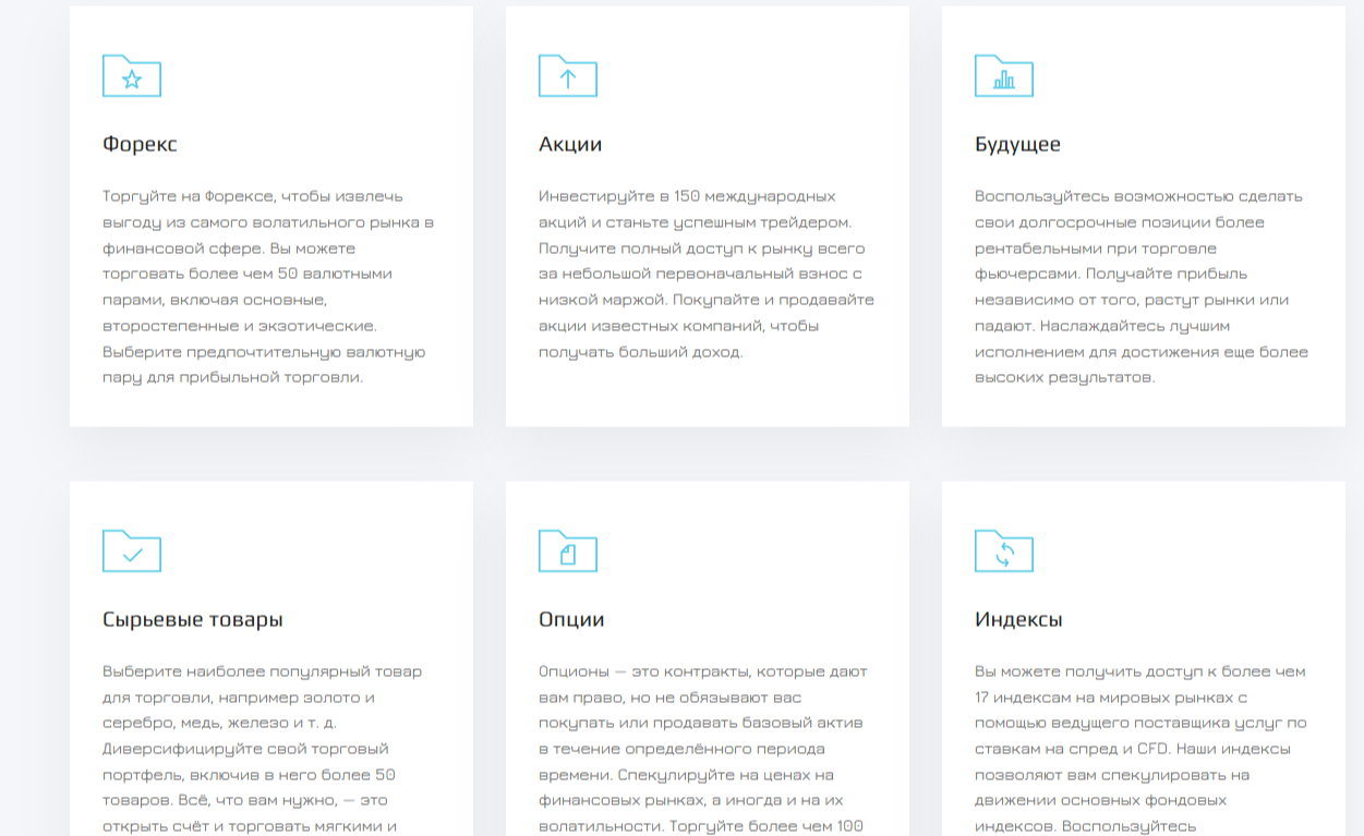 Дизайн веб-сайта фейкового брокера был выполнен в светлых тонах, имел простую навигацию и интуитивно понятный интерфейс. В шапке портала можно было увидеть разделы «Инвесткор», «О нас», «Рынки», «Торговля», «Поддержка», «Условия». Ни один из них не предоставлял читателям никакой полезной информации.