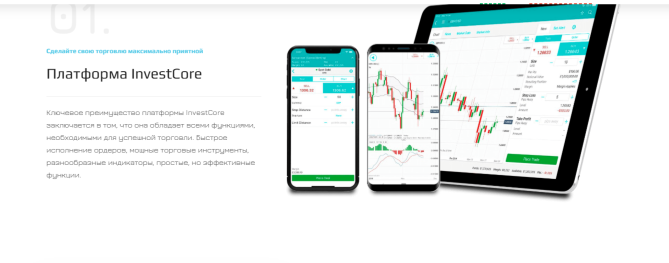 В 2022 году фейковый посредник предоставлял всем желающим доступ к трейдингу на инновационной платформе, функционирующей на ПК и мобильных устройствах. Торговать с упомянутым брокером могли трейдеры из разных государств, кроме Афганистана, США, Франции, Ирана, Ирака, Японии, Канады, Британской Колумбии, Израиля и ОАЭ. Брокерская организация InvestCore предоставляла клиентам торговлю валютными парами, акциями, сырьевыми товарами и другими активами. Торговая платформа брокера обеспечивала: