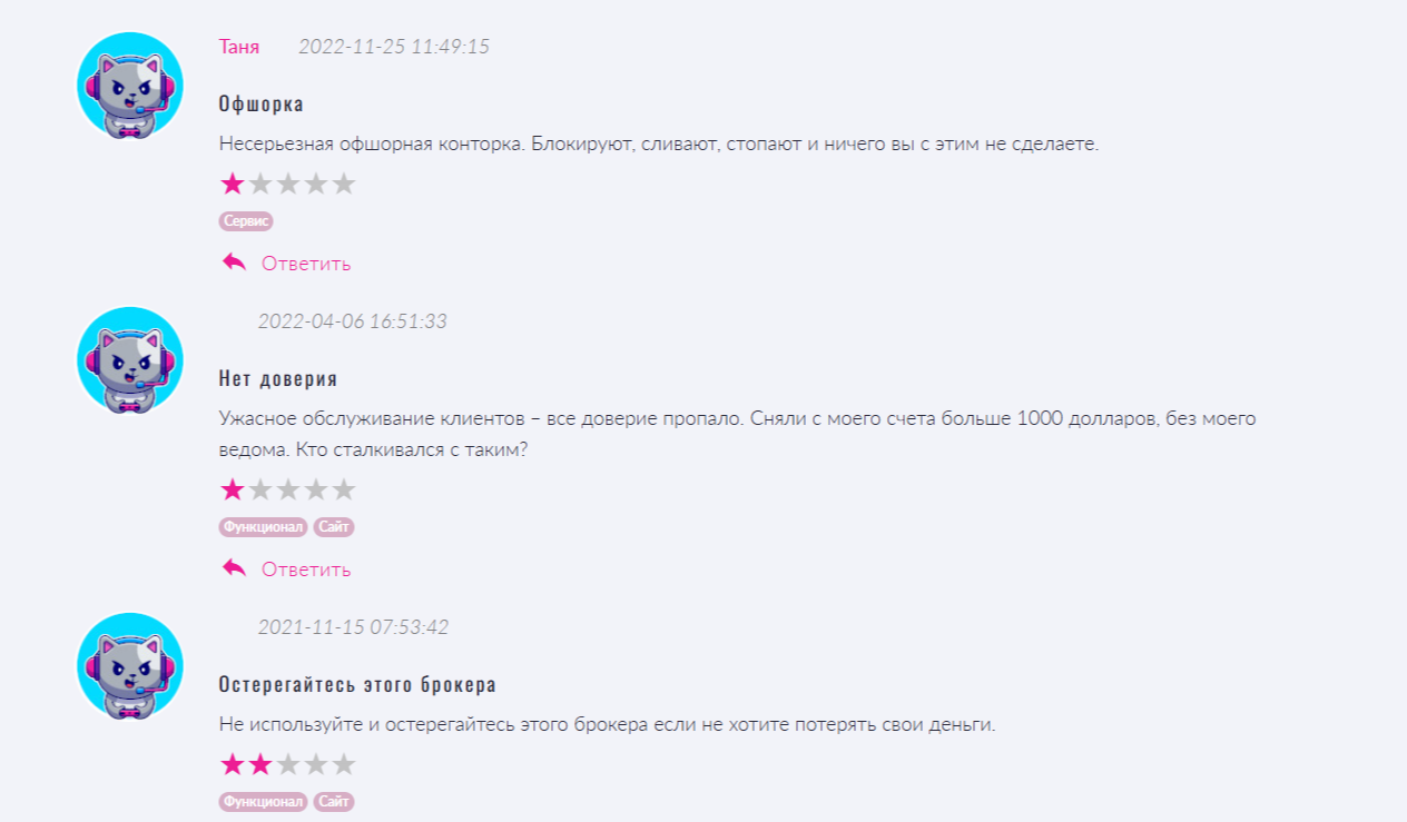 Резкие негативные комментарии о псевдо-брокере наша команда обнаружила на сторонних веб-сайтах в мировой паутине. В них посредника называют офшорной конторой, пользователей же предостерегают от сотрудничества с данной организацией.