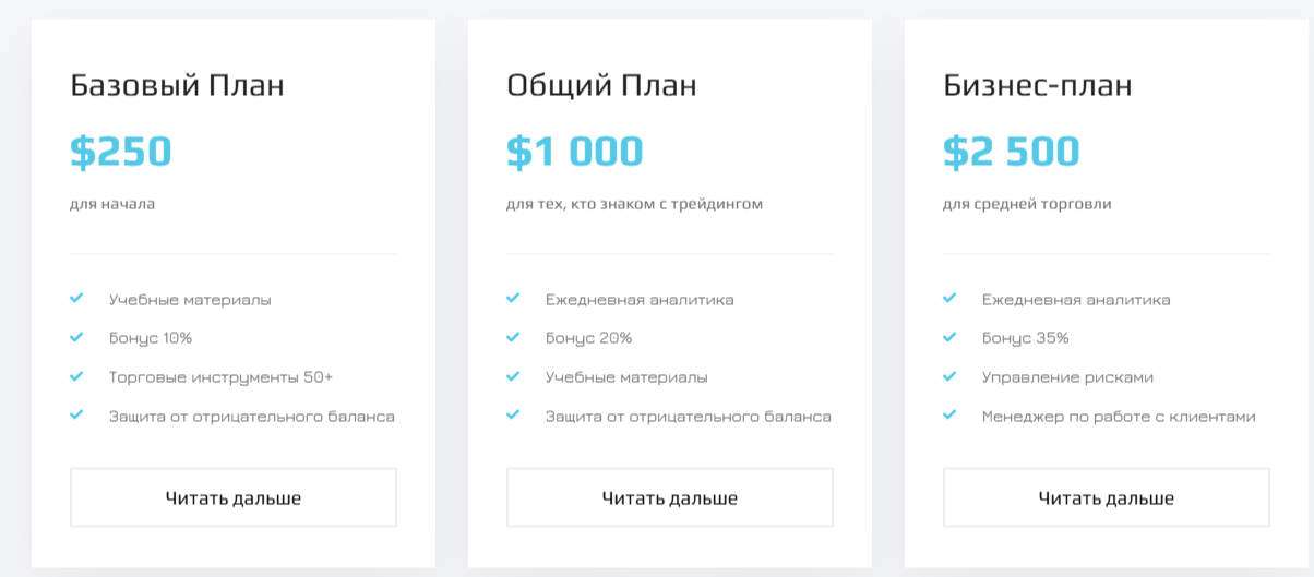 1. «Базовый план». Депозит от 250 долларов, учебные материалы, бонус 10%, 50+ торговых инструментов, защита от отрицательного баланса.