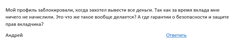 • Блокировка профилей при выводе денег с депозита. Вкладчики компании могут потерять финансы при сотрудничестве с платформой.