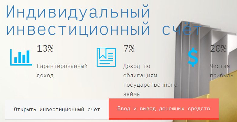 Компания обещает клиентам гарантированный доход в размере 13%, 7% по облигациям госзайма, итого 20% чистой прибыли. Услуга брокерского обслуживания счета оценивается в 0,0019% от суммарного торгового оборота. Величина минимального депозита не оговорена.