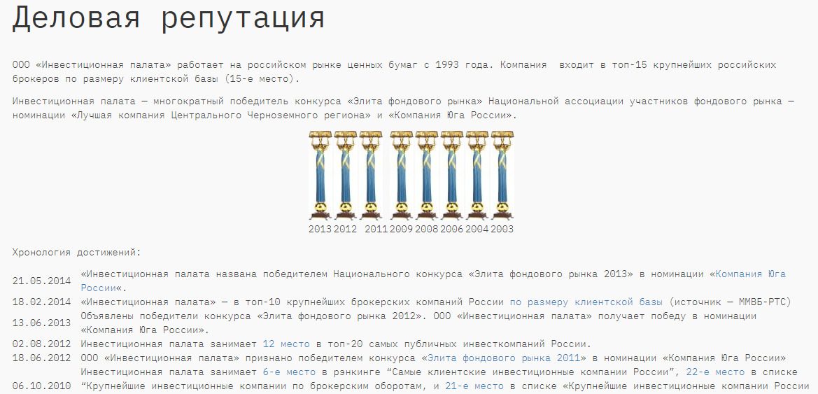 Инвестиционная Палата — официальный брокер, работающий под контролем ЦБ РФ, ФСФР РФ, Минфина России со счетами частных лиц на Московской Бирже ММВБ-РТС. Предприятие имеет все необходимые лицензии, давно известно на внутреннем финансовом рынке страны, но можно ли считать его безопасным партнером? Как оказалось, нет, в ходе обзора увидим, почему это так.