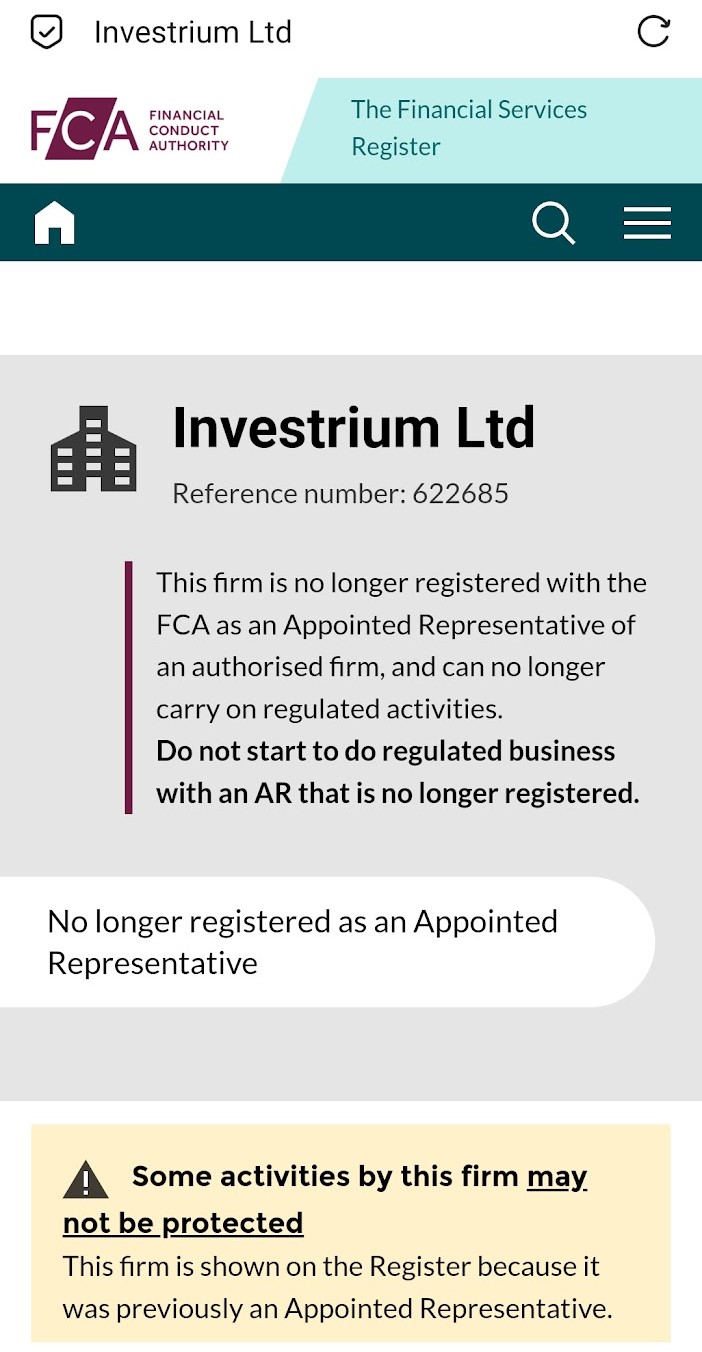 Нам известно, что брокер начал свою деятельность в августе 2024 года, однако сам Investrium заявляет, что работает в своей сфере уже больше 15 лет. Также компания говорит, что имеют лицензии от FCA, это значит, что их финансовая деятельность сильно регулируется.