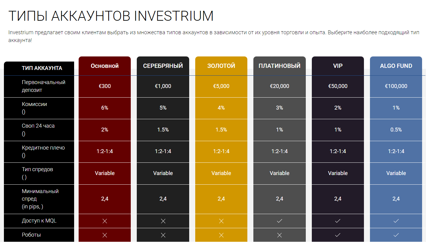 Брокер Investrium оказывает обслуживание поддержкой аккаунты со всеми видами счетов. Чтобы пополнить минимальный счет вам понадобится 300 евро. Однако для внесения и вывода средств из такого аккаунта также придется оплачивать комиссию в 6 процентов. Мы также выяснили преимущества проекта: