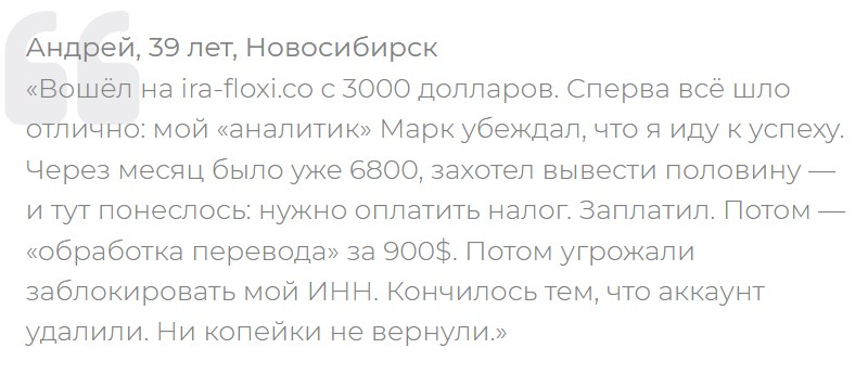 Отзывы на ira floxi co в сети только негативные, клиенты рассказывают о неудачном опыте трейдинга и инвестиций, прямо называют их мошенниками.