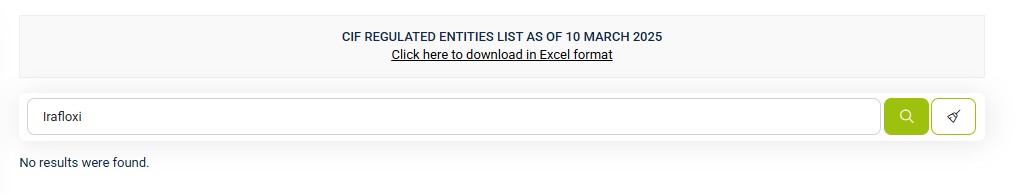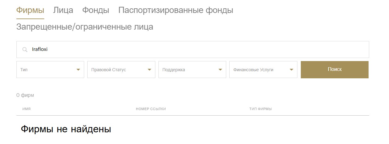 В разделе сайта под названием «Лицензии» написано, что деятельность брокера регулируется платформами DFSA, FCA, ASIC, CySEC, есть даже ссылки на лицензии, но при нажатии на них клиент попадает не на сайты регуляторов, а другие, внешне похожие. Мы проверили наличие компании «Ира флокси» в реестре Dubai Financial Services Authority и выяснили, что такой там нет.