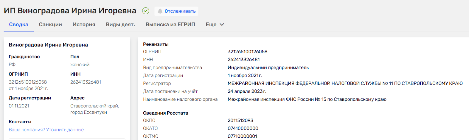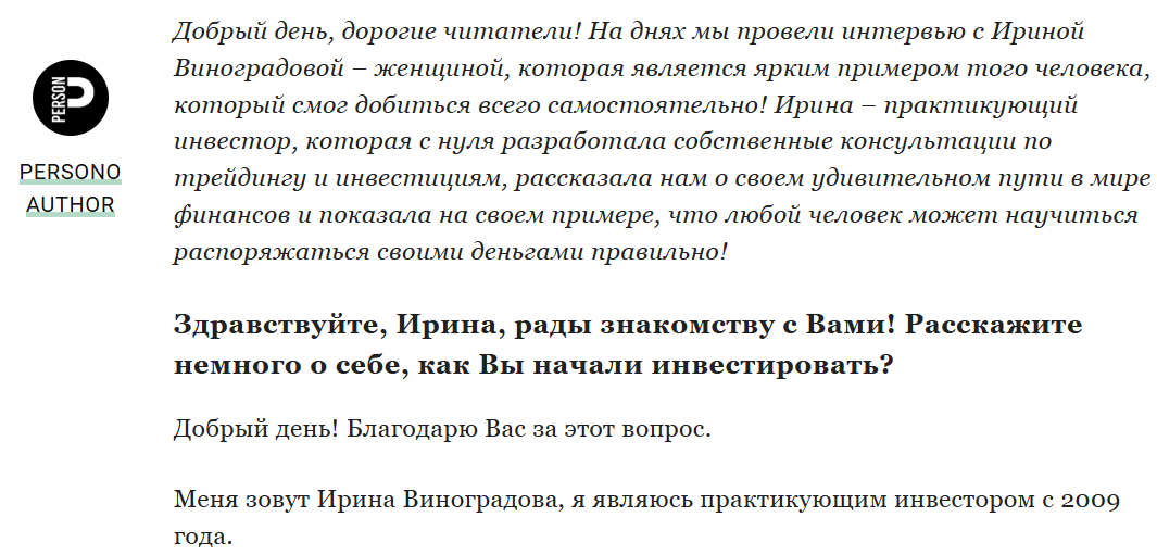 С другой стороны, сам факт публикации интервью ничего не доказывает, ведь результаты по инвестициям никак нельзя проверить, зато Ирина Виноградова зарегистрирована официально как ИП, что формально добавляет доверия.