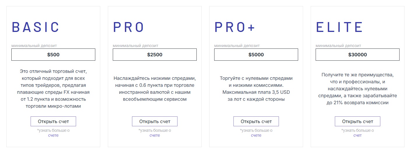 Что касается торговых счетов, то брокер Ironvale предлагает выбрать один из четырех доступных тарифов. Они отличаются суммой начального депозита, размером комиссии за услуги и некоторыми преимуществами.