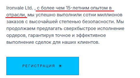 Адрес официальной онлайн-площадки проекта – Ironvale Pro. Мы решили начать проверку данного сайта с раздела «О компании», где расписана история становления организации и этапы ее развития. Также указано, что фирма работает в сфере трейдинга и инвестиций уже более 15 лет.