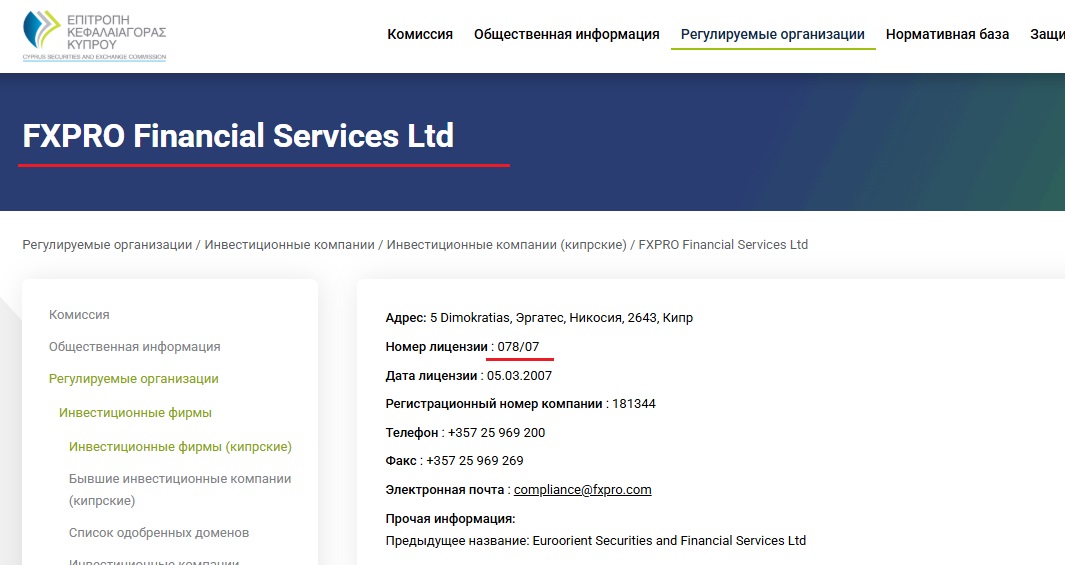 Подтверждение того, что лицензии у компании попросту нет, мы смогли получить при изучении реестра финансового регулятора CySec, который якобы и выдал разрешение на торговлю. Оказалось, что указанный лицензионный номер принадлежит абсолютно другой фирме.