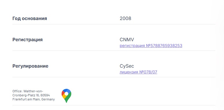 Однако вбив указанный адрес в онлайн-картах, мы поняли, что в данном здании компаний с подобным названием попросту нет. Публикация фейковых контактных данных – еще одна причина подозревать брокера в мошенничестве.