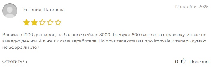 Во время изучения репутации компании мы узнали, что практически все отзывы о Ironvale носят негативный подтекст. Клиенты в один голос обвиняют брокера в мошенничестве. По словам одной из пострадавших, администрация площадки не только не хочет отдавать ей деньги, но еще и требует дополнительную комиссию.