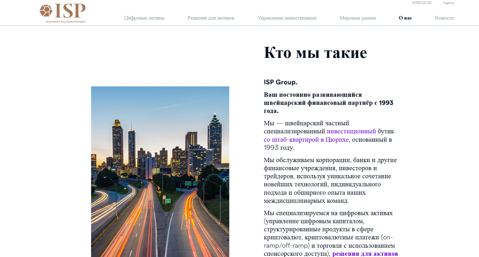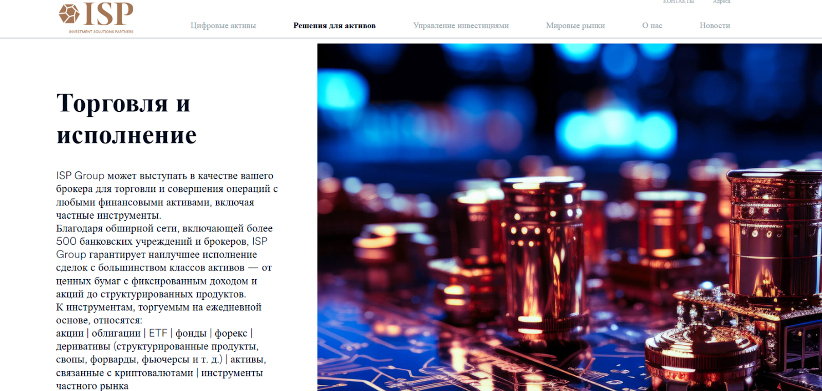 Сайт брокера имеет сдержанный дизайн, не выделяющийся яркими визуальными решениями. Оформление портала соответствует типовому шаблону для корпоративных ресурсов: много рекламных слоганов, мало конкретики. Шапка веб-сайта знакомит пользователей с разделами «Цифровые активы», «Решения для активов», «Управление инвестициями», «Мировые рынки», «О нас», «Новости». Раздел «О нас» повествует о компании из Швейцарии ISP GROUP, которая существует с 1993 года, имеет представительства в Дубае, Гонконге и Израиле.