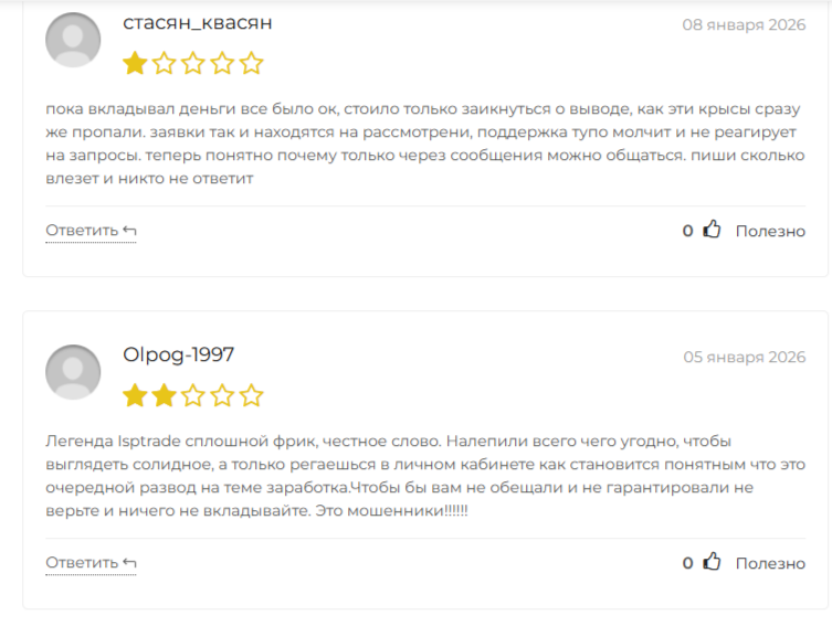 Все найденные комментарии о брокере Isptrade написаны в негативном ключе. В них пользователи делают акцент на присвоении денег клиентов, обмане и мошенничестве со стороны посредника.