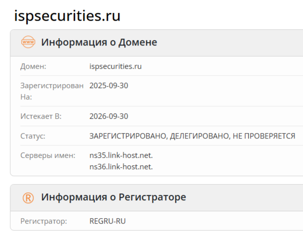 Домен ispsecurities ru появился в мировой паутине 30 сентября 2025 года. В качестве торговой платформы он используется всего 5 месяцев. Столь юный домен не может принадлежать солидной организации, которая ведет свою деятельность с 1993 года. Ну а надежные компании обычно предоставляют целевой аудитории реальные документы и гарантии безопасности.