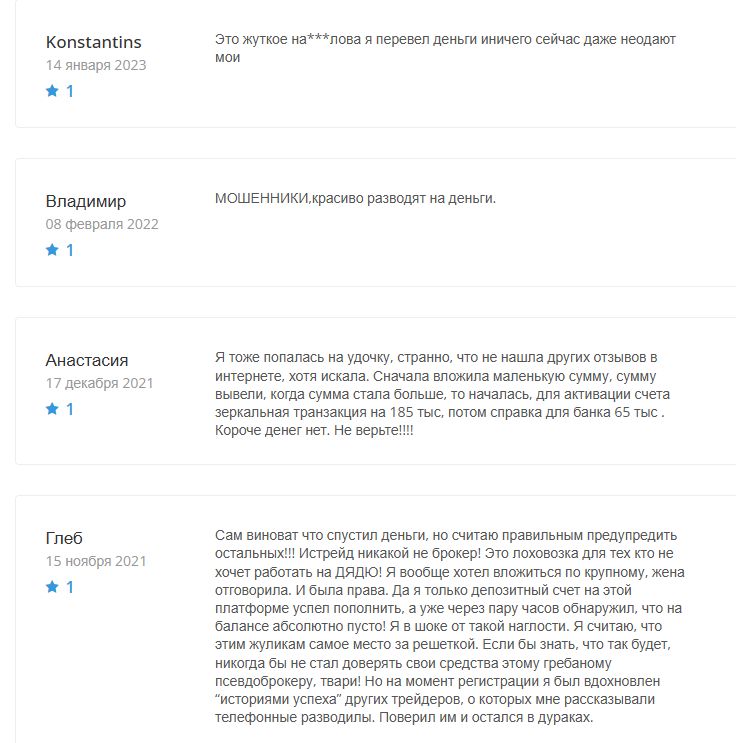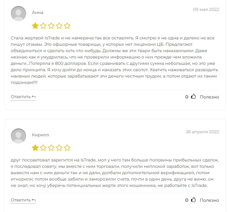 Отзывы в интернете почти все негативные. Люди сообщают, что лже-брокер IsTrade снимает все деньги со счета и занимается вымогательством.