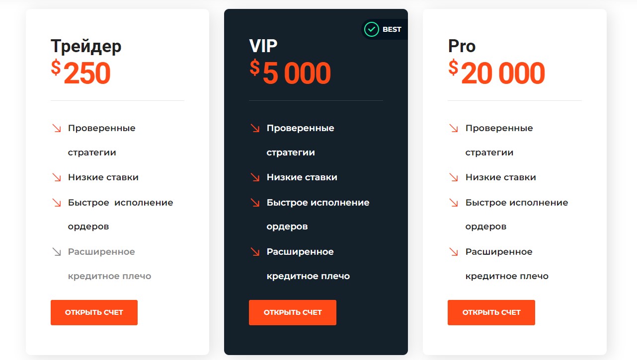 Брокер предлагает пять типов счетов с различными суммами минимального депозита: