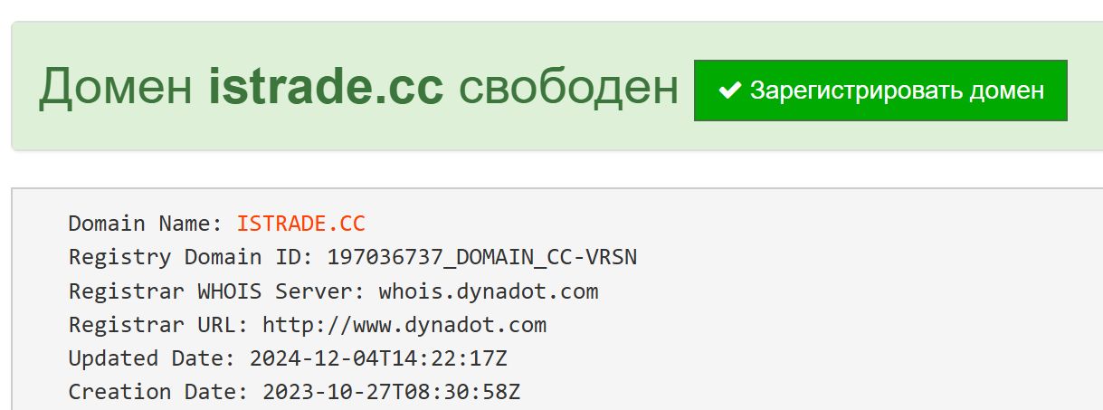 Домен Istrade cc был зарегистрирован в 2023 году, но важно то, что сейчас он полностью свободен.