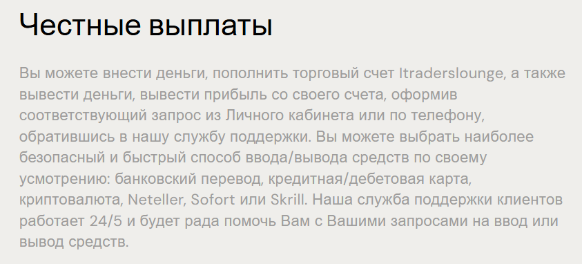 Для трейдинга важно быстрое решение любых проблем. Единственным способом связи с техподдержкой брокера является электронная почта support itraderslounge com, плюс работает поддержка только 5 дней в неделю.