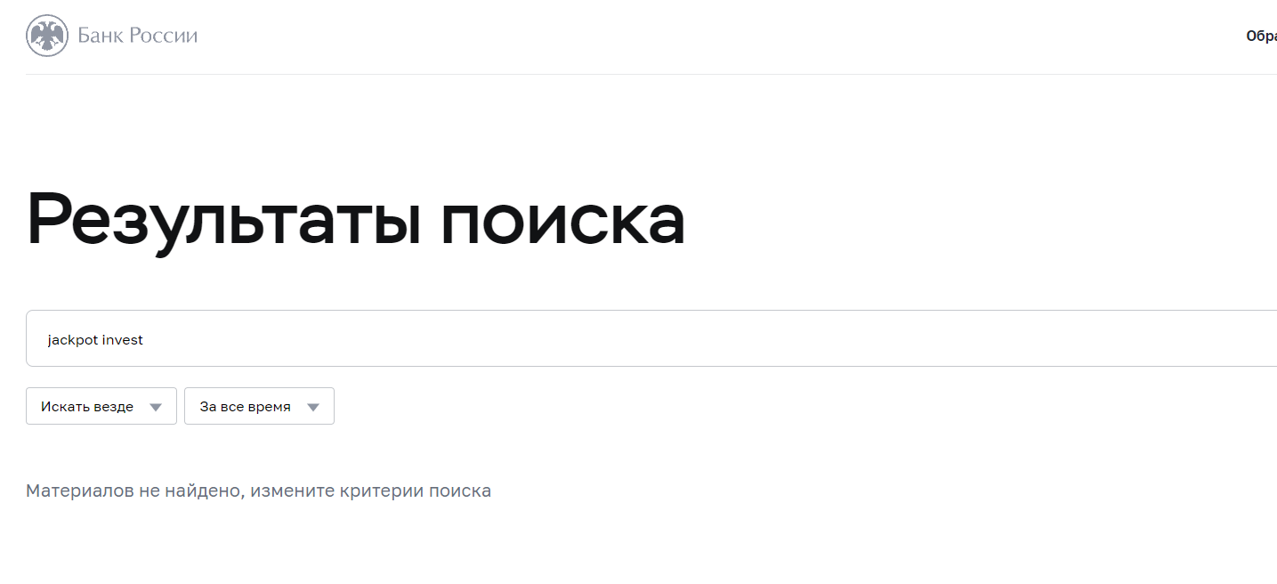 Сайт Jackpot invest не предоставляет никакой информации о том, как и кем он регулируется. Также поискав информацию на официальном ресурсе ЦБ РФ, мы ничего не обнаружили, возможно, это из-за того, что компания действительно только недавно была зарегистрирована.