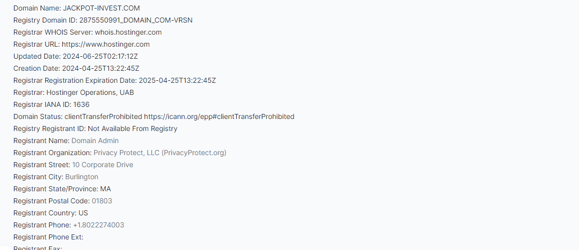 На сайте Jackpot invest com написано, что их проект и платформа запустилась в 2024 году. Проверив всю информацию на официальном Whois-сервисе, все это оказалось правдой, а ресурс был создан в апреле этого же года.