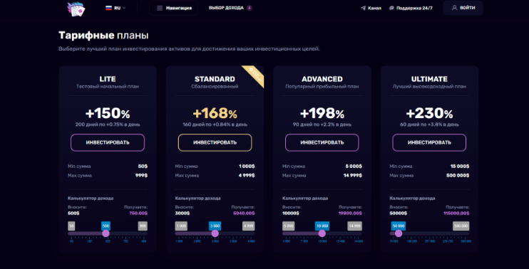 • Лайтовый, который выглядит как тестовый план. Они обещают, что при минимальной инвестиции от 50 до 1000$ можно заработать 150% за 200 дней.