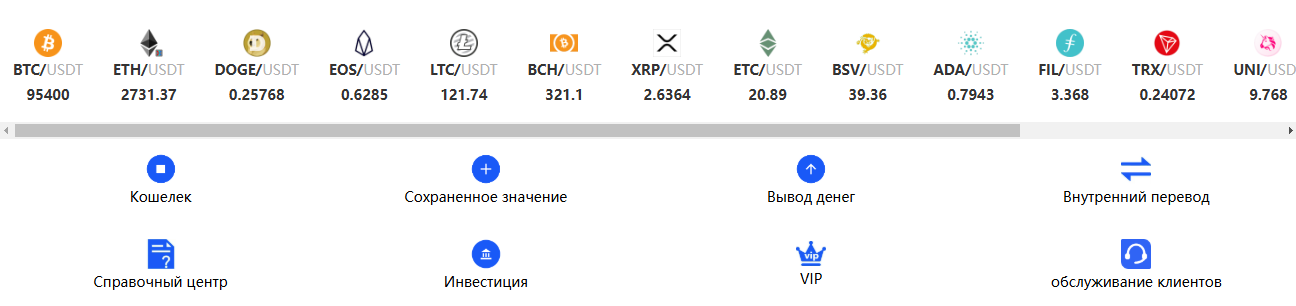 На главной странице сайта перечислены основные активы, которыми можно торговать на бирже. Есть также кнопка для регистрации и входа на площадку.