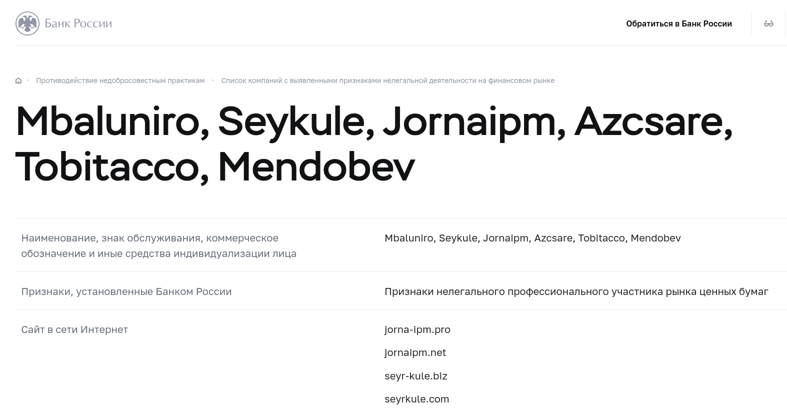 - Домены Jornaipm Net и Jorna-Ipm Pro официально находятся в черном списке Центрального банка РФ;