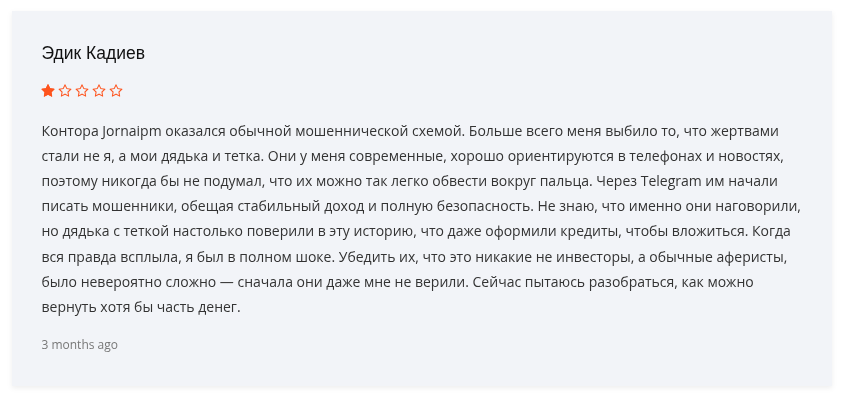Если вы уже имели неосторожность связаться с посредником Jornaipm Net, обязательно поделитесь опытом в комментариях под статьей. Ваш отзыв поможет другим трейдерам вовремя распознать скам и не попасть на уловки аферистов.
